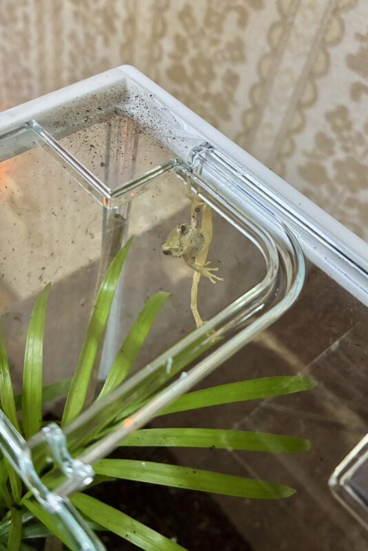 先日はスパイダーマンの様なアクロバットなポーズを決めているところを見せてくれました。かわいいよカエルちゃん!