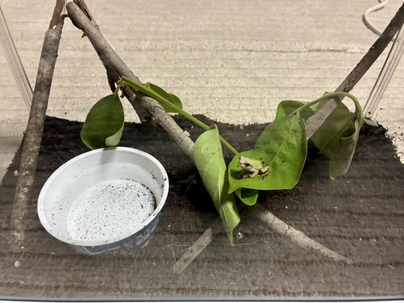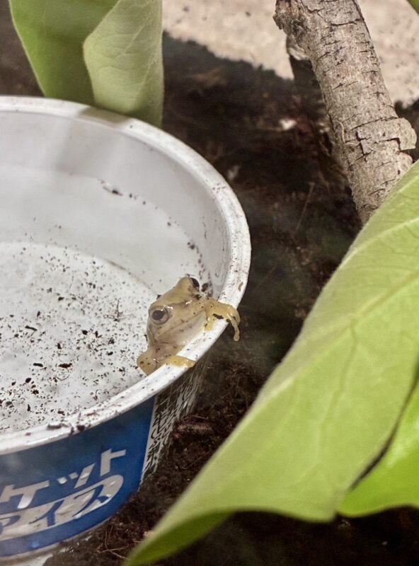侵入してきた子は恐らく二ホンアマガエル。樹上生活をする種類なので木の枝と葉っぱを入れて高さを出して登れるようにしました。