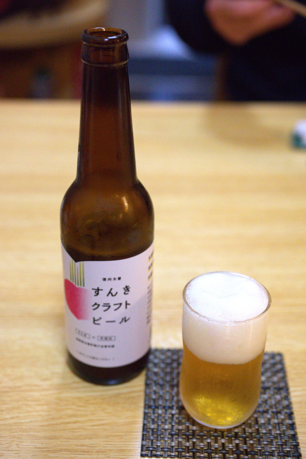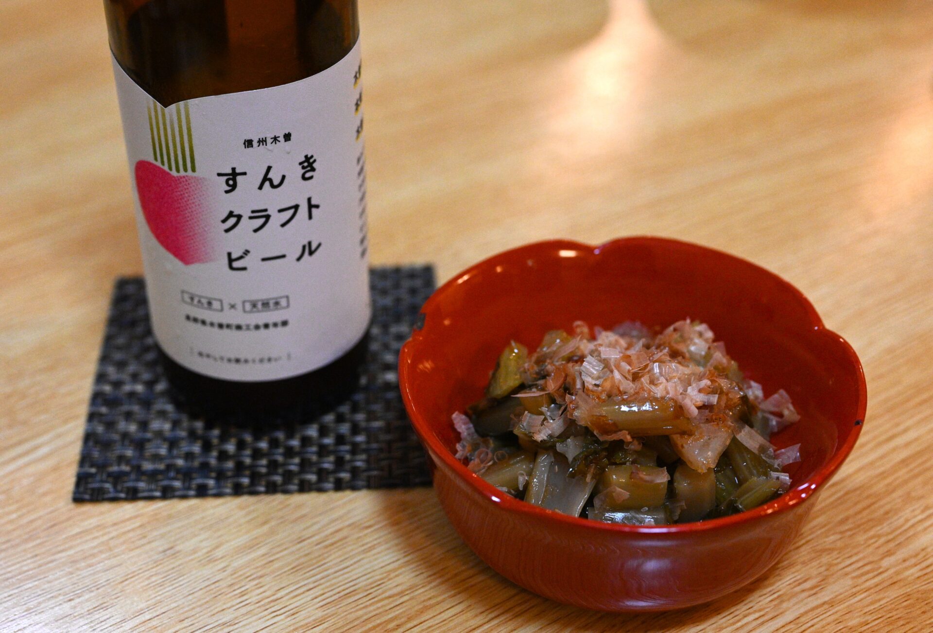 木曽町商工会の青年部の方々によって作られたクラフトビールで、すんきの漬け汁と木曽の湧水を使っているようです。飲んでみるとスッキリとしていて飲みやすく、最後にすんき特有の酸味が少し感じられました。